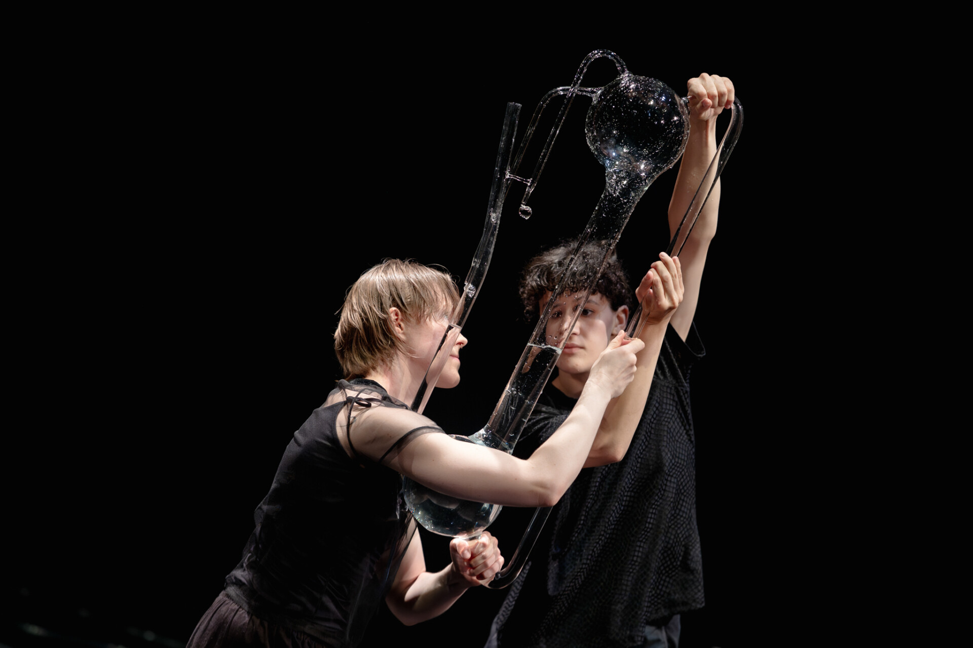 The cast of the show consists of four young dancers, who were selected following an international workshop-audition attended by 45 artists from 12 countries: Silvia Brazzale (Italy), Chelsea Reichert (USA), Ada Anghel, and Laura Murariu (Romania). On stage, they interact with fluid objects created by Ioana Vreme Moser—transparent glass structures and tubes that set 50 liters of water in motion. These hybrid objects, with shapes resembling organs or underground waterways, act as “components” of a fluid computer, where the speed, resistance, and oscillation of water currents generate sound. Sometimes the dancers initiate the interaction, triggering flows, loops, or blockages through touch and movement; other times, the objects themselves provoke the dancers, releasing sounds and flows that demand a response. The result is a constant exchange — always in motion, never silent. The immersive sound universe is created by Simina Oprescu.